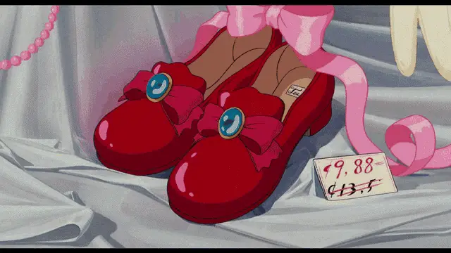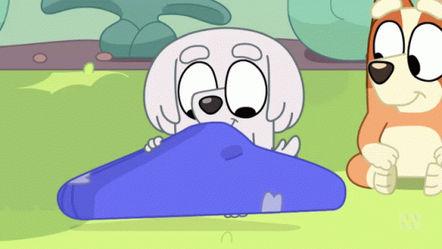 Lila, a white cartoon dog, excitedly opens a blue parcel to reveal a yellow object, watched by Bluey.