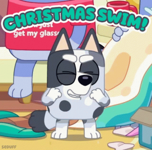 Muffin from Bluey is excited for a Christmas swim, wearing a festive shirt.