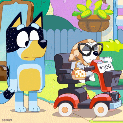 Muffin rides her Granny Mobile with a '$300' sign, while Bluey stands beside her.