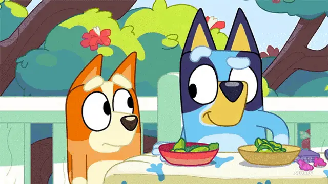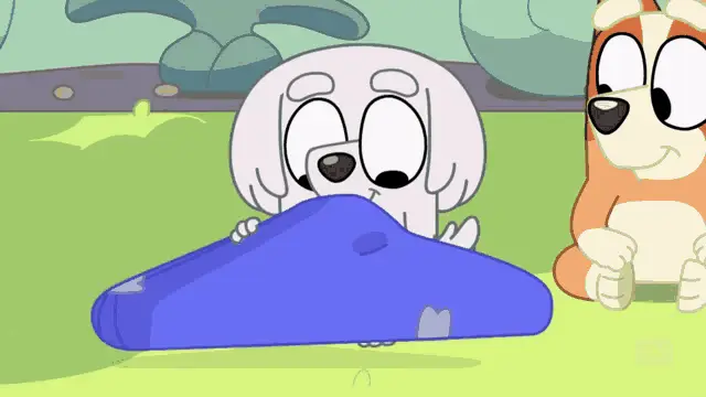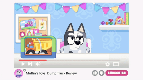 Muffin Heeler from Bluey expresses her strong desire for 'Cat Squad Kitty Island' while watching a dump truck toy review.