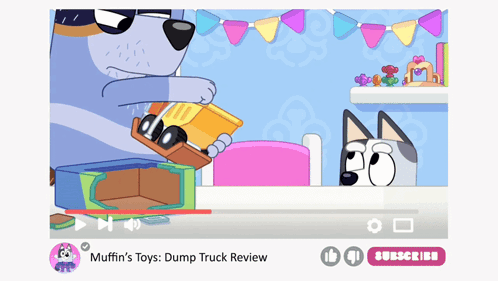 A Bluey character unboxes a toy dump truck in 'Muffin's Toys: Dump Truck Review' on YouTube, featuring Muffin Heeler.