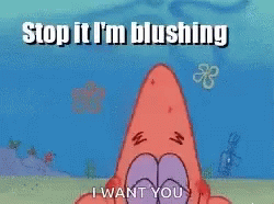 Patrick Star from Spongebob Squarepants blushes, with captions 'Stop it I'm blushing' and 'I WANT YOU'.