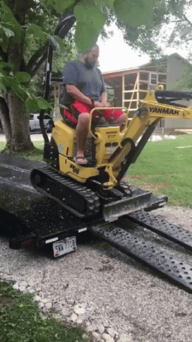Man operates Bmc Ricktator Yanmar excavator, driving it onto a trailer ramp.