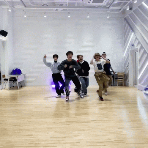 K-pop group JustB performing an energetic dance, featuring members like Song Byeonghee (Bain).