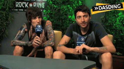Oliver Sykes and Jordan Fish of Bring Me The Horizon react with 'Oh My God' during a Rock am Ring interview.