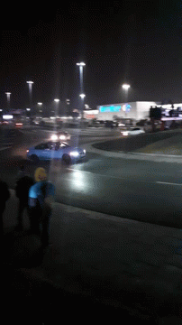 A blue BMW car performs an impressive slide or drift on a road at night.