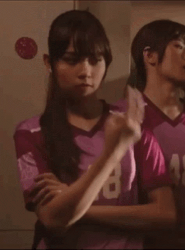 BNK48 members Jib and Suchaya in purple jerseys, with Jib making a peace sign.