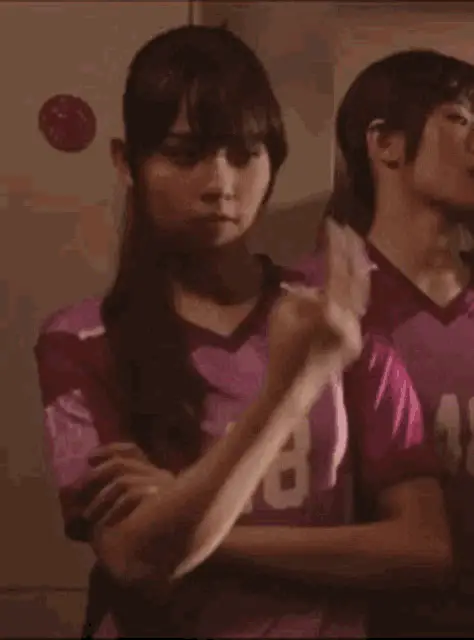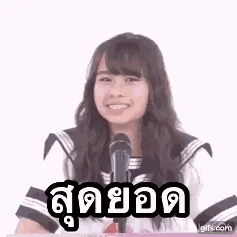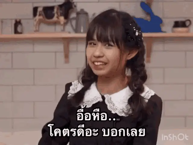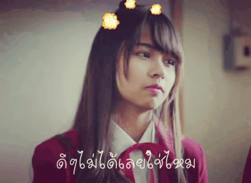 BNK48 member Jib with a thoughtful expression, wearing a red uniform, with the Thai caption 'Can't be good, can it?'