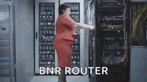 A woman in a red dress stands in a server room, with 'BNR ROUTER' text overlaid.