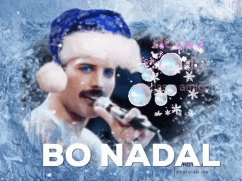 Freddie Mercury in a Santa hat sings 'Bo Nadal' (Merry Christmas) in a festive, icy scene.
