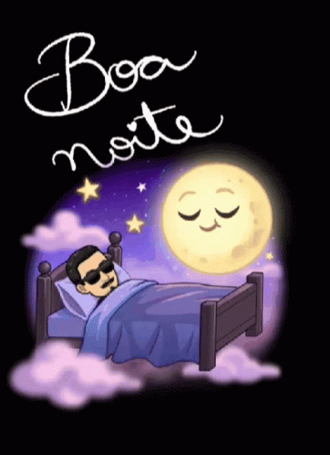 Animated 'Boa Noite' scene with a man sleeping peacefully under a smiling moon.