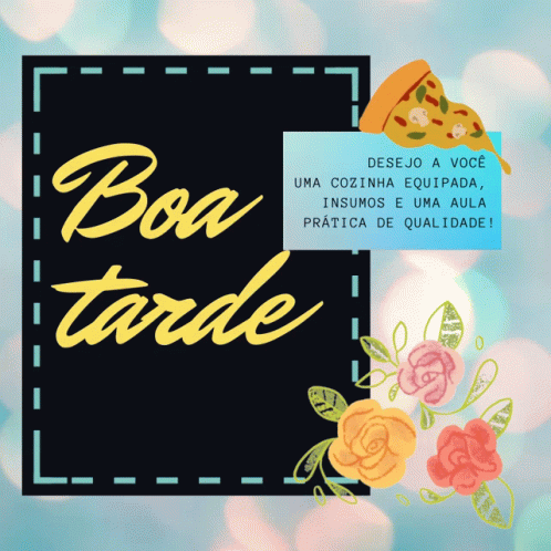 Animated 'Boa Tarde' greeting card with sparkling effects, a slice of pizza, and decorative flowers.