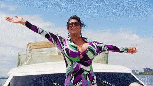 Angela Raiola enjoying a sunny boat party, arms outstretched in a vibrant dress, embodying summer relaxation.