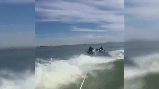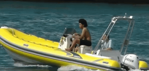 A man with curly hair drives a bright yellow inflatable boat on blue water, with another person in the back.