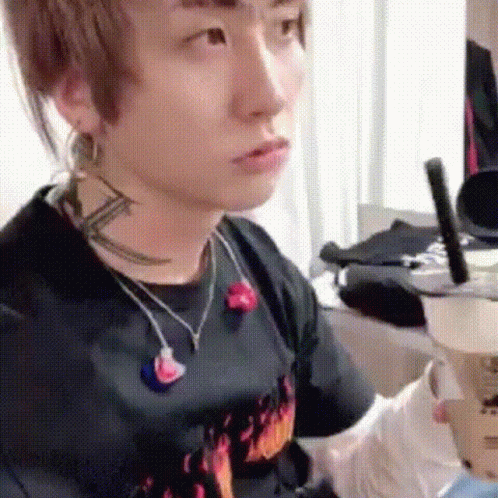 Tsuzuku Mejibray, with his distinctive neck tattoo, sips boba tea and makes a funny face.