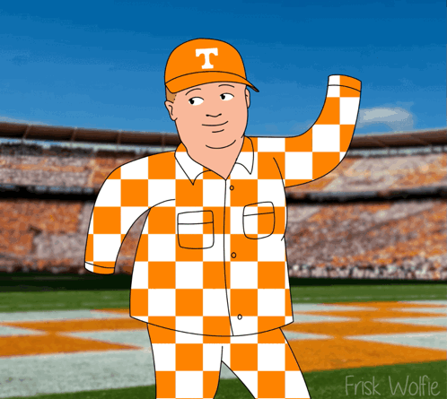 Bobby Hill, in Tennessee Volunteers gear, dances on a football field, celebrating with Bobby Heupel and the Vols.