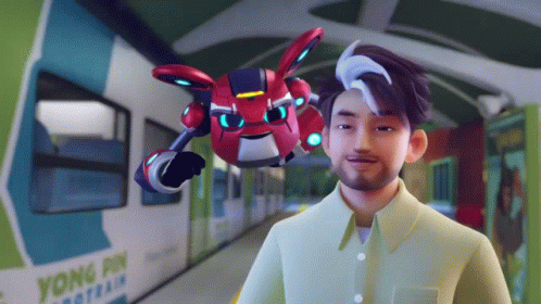 Boboiboy waves cheerfully while Mechamato, his robot companion, captures the moment with a phone, near a train.