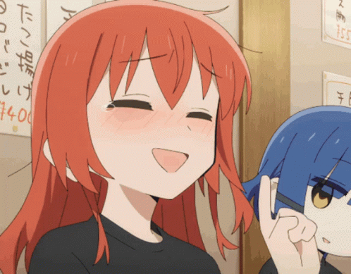 Ikuyo Kita from Bocchi The Rock smiles brightly, with a hint of blush, in a charming anime scene.