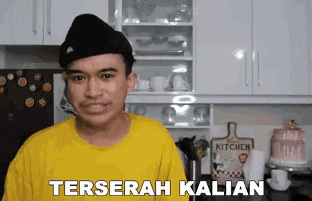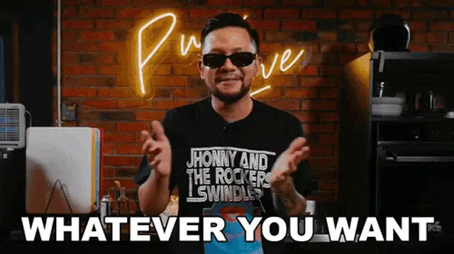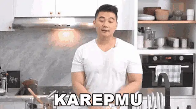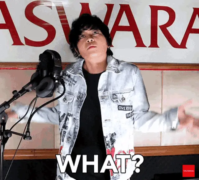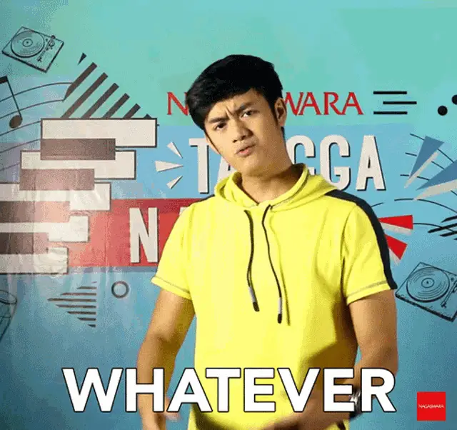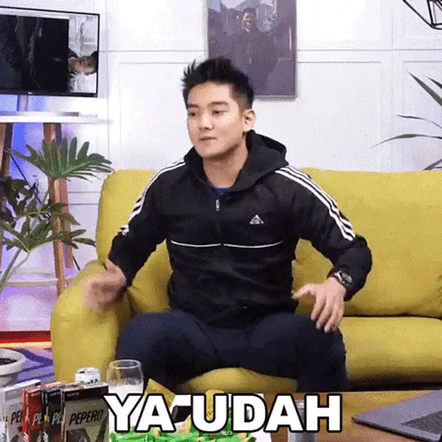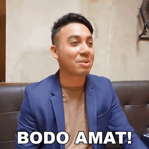 Gunawan expresses 'Bodo Amat!' (I don't care!) while sitting on a couch in a blue suit.