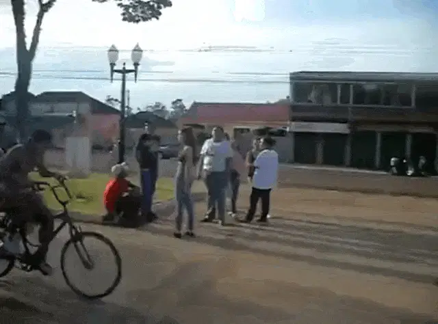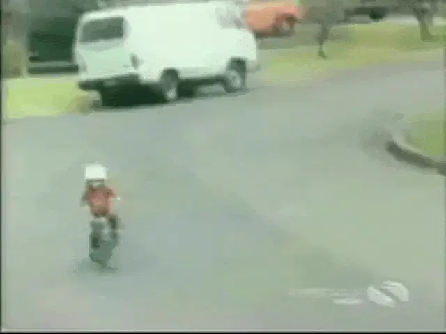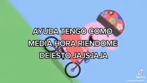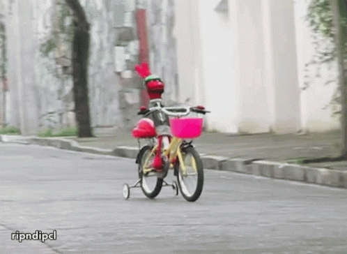 Bodoque from 31 Minutos attempts to ride a bicycle with training wheels but takes an unexpected fall.