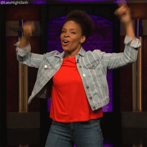 Amber, wearing a denim jacket and red shirt, performs an energetic body roll and shake on the Late Night Seth stage.