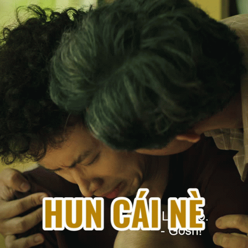 Trấn Thành and Tuấn Trần in a scene from Bố Già, with the playful Vietnamese caption 'HUN CÁI NÈ' (Kiss me).