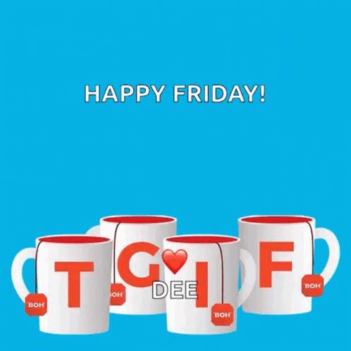 Celebrate the end of the week with animated BOH tea mugs spelling out 'TGIF' and wishing a Happy Friday.