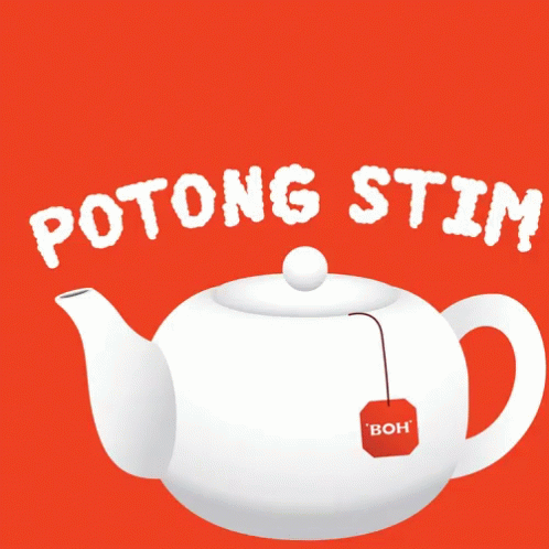 Animated logo for Boh Tea featuring a white teapot, 'Potong Stim' text, and steam effects.