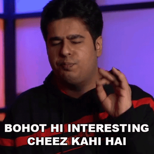 Kripz (Umesh Kripalani) reacts with a funny face to something 'very interesting,' as text appears on screen.