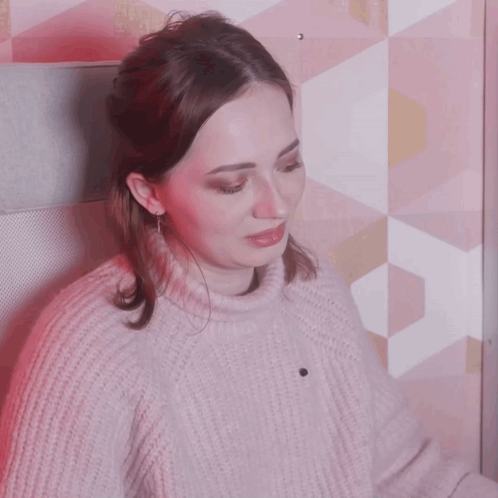 Yulya Boyarova laughing and smiling while wearing a pink sweater and earbuds.