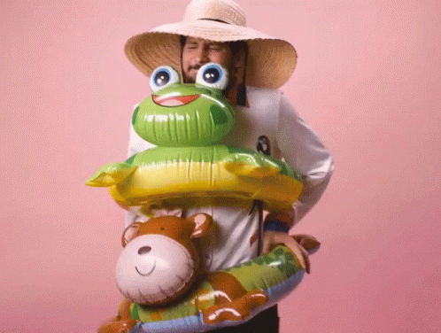 Caio Braz poses with inflatable frog and monkey floats, looking playfully annoyed in a straw hat.