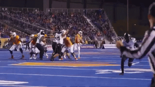 Boise State Broncos player scores a touchdown on the iconic blue turf field during a night game.