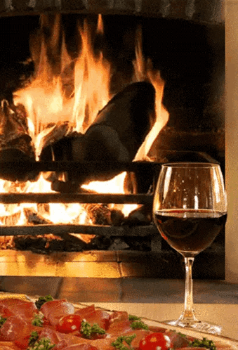 Glass of red wine and pizza by a cozy fireplace, creating a warm and inviting atmosphere.