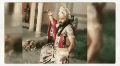 A man in a traditional costume with outstretched hands performs in front of a building.