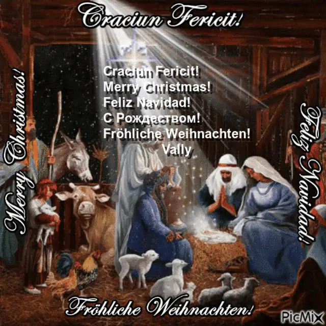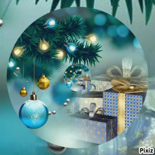 Festive Christmas tree with blue and gold ornaments, gifts, and a sparkling holiday atmosphere.
