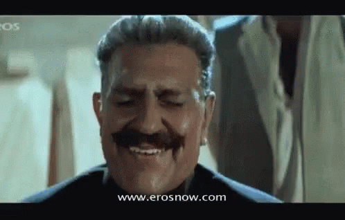 Amrish Puri as Mogambo delivers his iconic, villainous laugh in a classic Bollywood scene, with the Eros Now watermark visible.