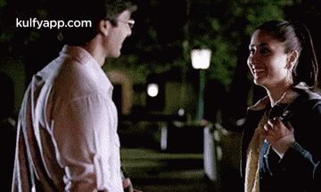 Kareena Kapoor and Shahid Kapoor share a warm hug in a scene from the Bollywood movie Jab We Met.