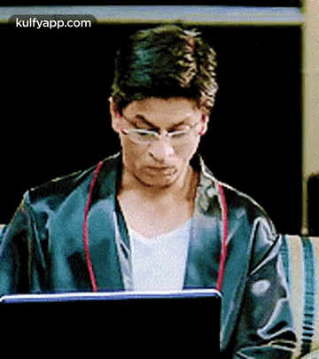 Shah Rukh Khan reacts with surprise and a smile while looking at a laptop, a popular Hindi reaction.
