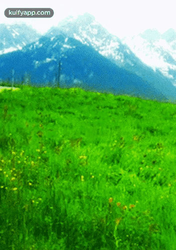 Vibrant green field with yellow flowers, majestic snowy mountains. An edit featuring Kajol and SRK.