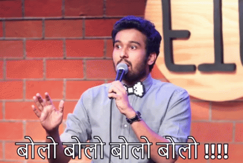 Comedian Sahil Shah on stage, holding a microphone with an expressive look, with Hindi text 'Bolo Bolo Bolo Bolo' overlaid.