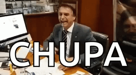 Jair Bolsonaro laughing heartily at his desk with the word "CHUPA" overlaid on the video.