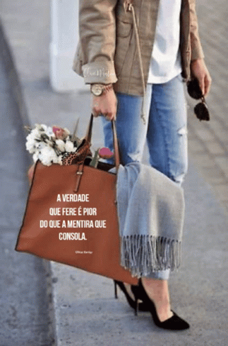 A woman carries a brown tote bag with flowers, a butterfly, and an inspirational quote by Chico Xavier.