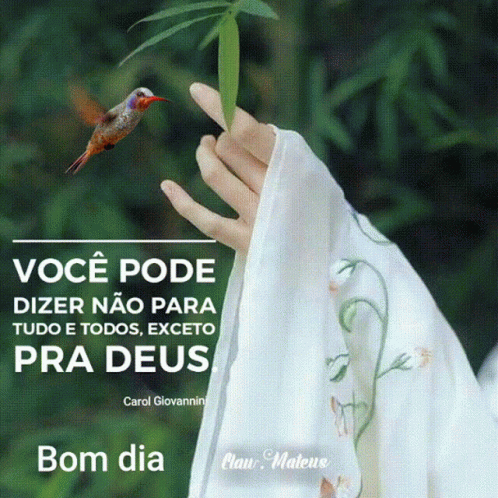 A hand holds a plant as a hummingbird flies by, featuring the quote 'You can say no to everything and everyone, except to God' by Carol Giovannini, wishing a good morning.