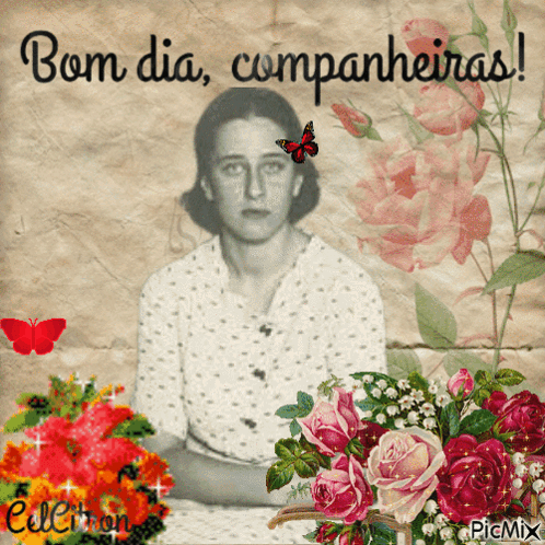 Olga Benário Prestes in a vintage collage, surrounded by flowers, with the greeting 'Good morning, companions!'