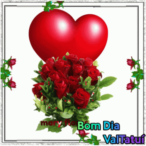 A vibrant image featuring a red heart, a bouquet of red roses, and the greeting 'Bom Dia ValTatuí'.
