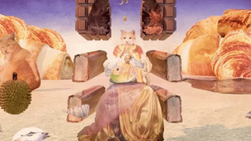 Surreal collage animation featuring cats, bread, chocolate, and human figures in a dreamlike landscape, inspired by Salvador Dalí.