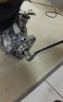 A person uses a large wrench to adjust a component on a mechanical part, likely an injection pump.