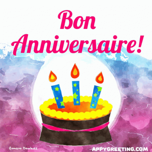 Animated birthday card with cake and candles, wishing 'Bon Anniversaire' and 'Joyeux Anniversaire'.