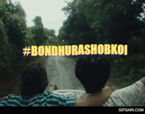 Two friends enjoying a road trip, looking out from a car window with the hashtag #BONDHURASHOBKOI.