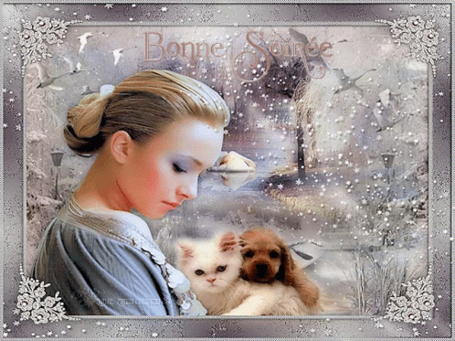 A beautiful woman holds a cute cat and dog, wishing 'Bonjour Bonne Journée' to viewers.